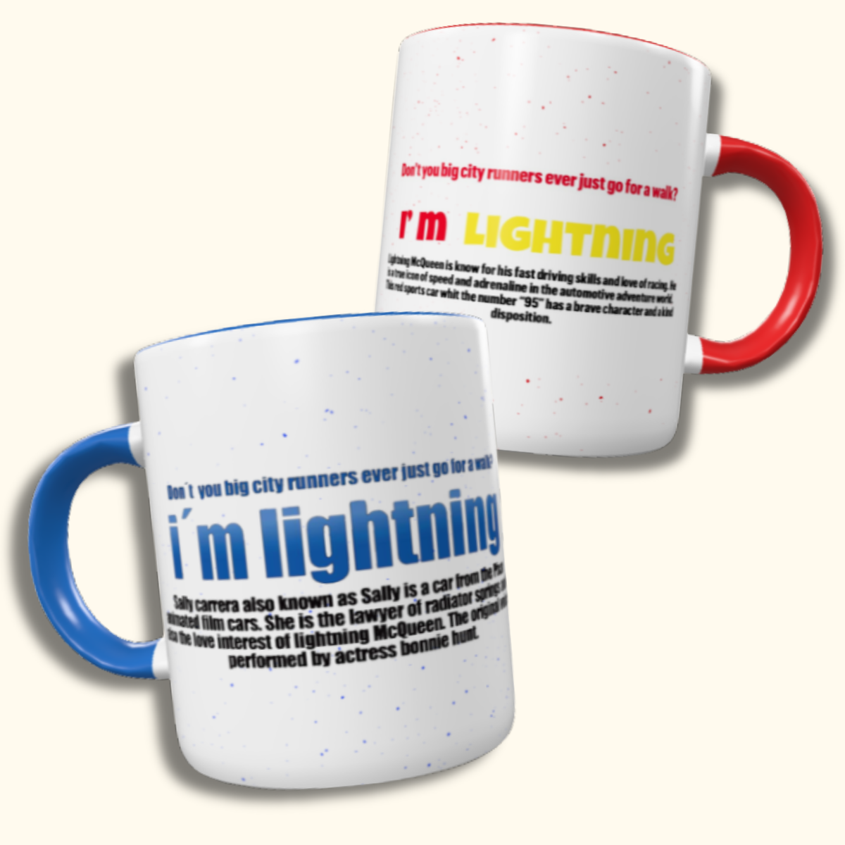 O kit inclui uma caneca com a arte do McQueen (visual marcante, predominância de tons vermelhos) e outra com a arte da Sally (linha elegante, tons azulados).